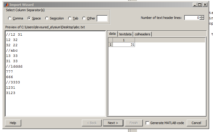 Import mixed data from text file into table. I have made the follow, i have open a file input.txt, the first 4 bytes of my input file give me the total of data aquisitioned, so i need transform it to a. I'm trying to open a txt file in matlab and produce a colormap with the data in the file.